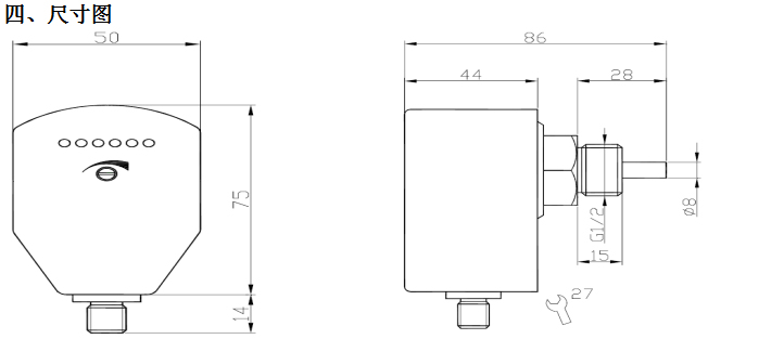 將流量開關(guān)裝好,使介質(zhì)以需要監(jiān)測的流速流動,擰開面板上的螺絲,調(diào)整電位計, 使第一個綠色LED怡好變亮。此后當(dāng)流速低于當(dāng)前值時,開關(guān)就釋放(紅燈亮)。若要使開關(guān)點比當(dāng)前流速小,可調(diào)整電位計(順時針旋轉(zhuǎn)螺絲刀)使綠色 LED多亮一些。