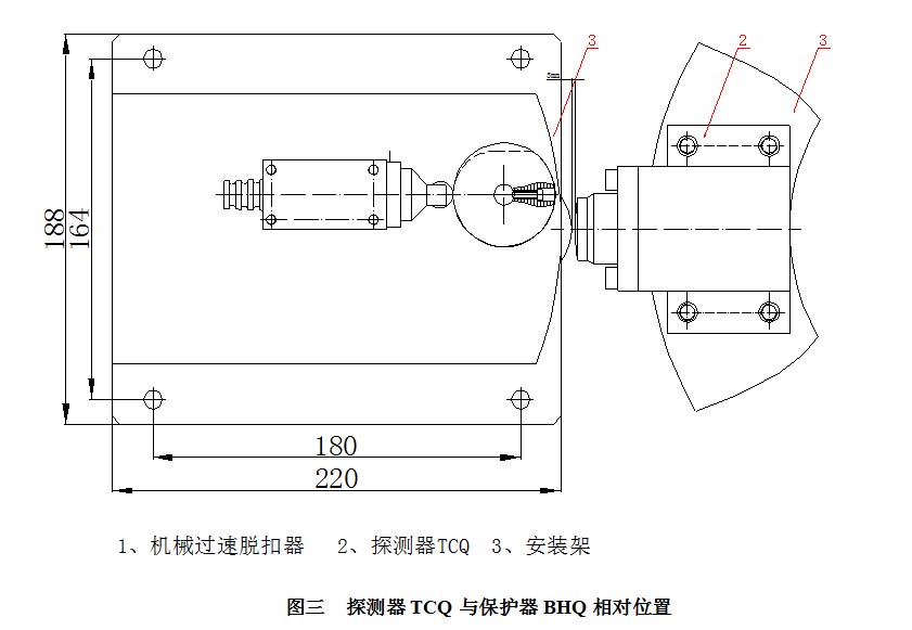 3、安裝過速保護(hù)器BHQ(由業(yè)主自己根據(jù)現(xiàn)場情況配裝,應(yīng)有足夠的空間供保護(hù)器完成手動(dòng)復(fù)位)及過速保護(hù)器BHQ的安裝螺栓不能完全緊固,以便于后面調(diào)整,安裝時(shí)要求液壓閥中心高度與過速探測器在同一高度,同時(shí)脫扣裝置的一邊與主軸中心線重合(如圖三),然后鎖緊螺栓。