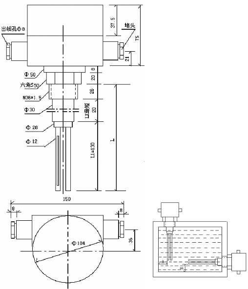 “L1”長度范圍130mm必須全部浸入油中,并且電極距離油箱壁“A”及“B”大于3mm以上。
